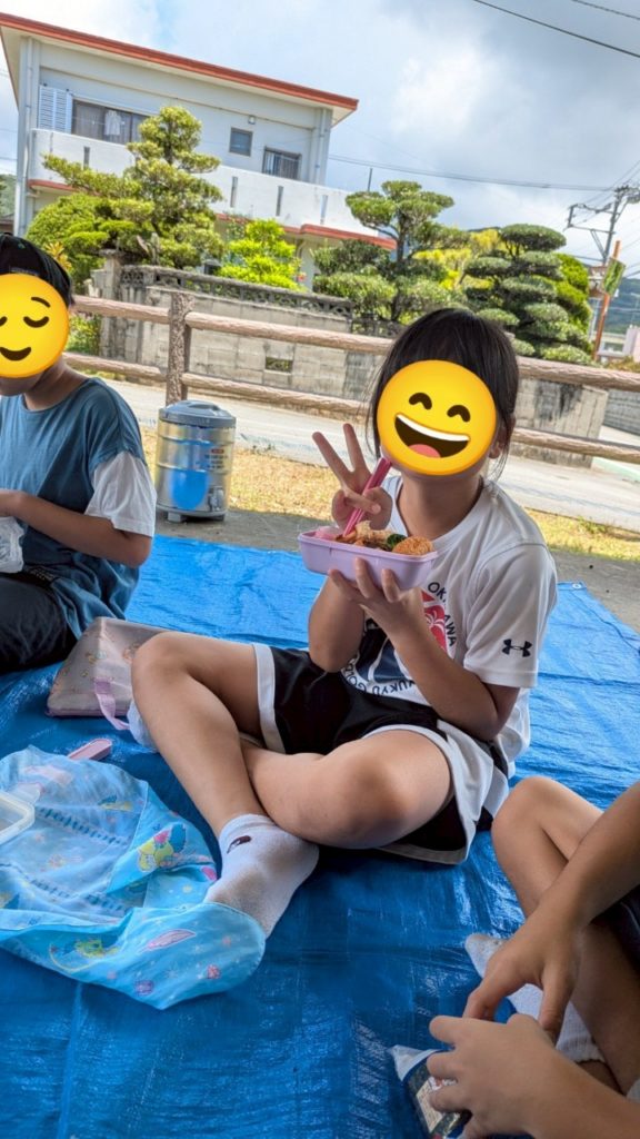 昼食時間です🍚今日は『伊芸ガジュマル公園』でブルーシートを広げて皆で食べました!