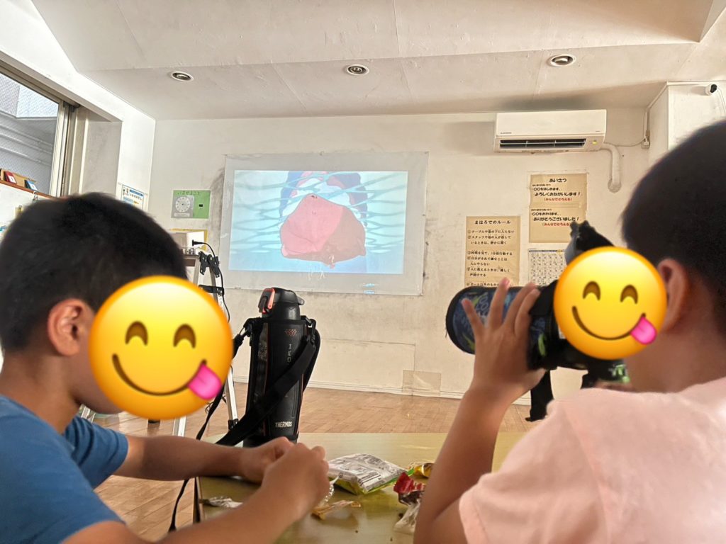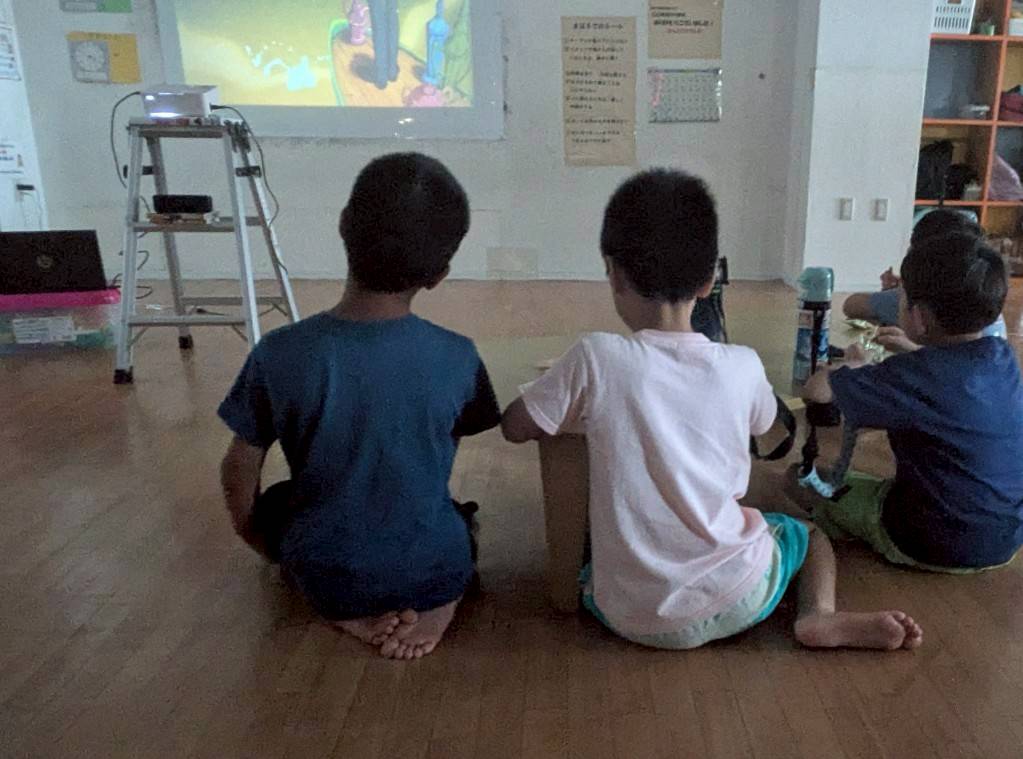いつもの明るい事業所とは違って電気の消えた薄暗い事業所の雰囲気がなんだか本当の映画館みたいでワクワクしている様子のまはろっ子達( *´艸`)