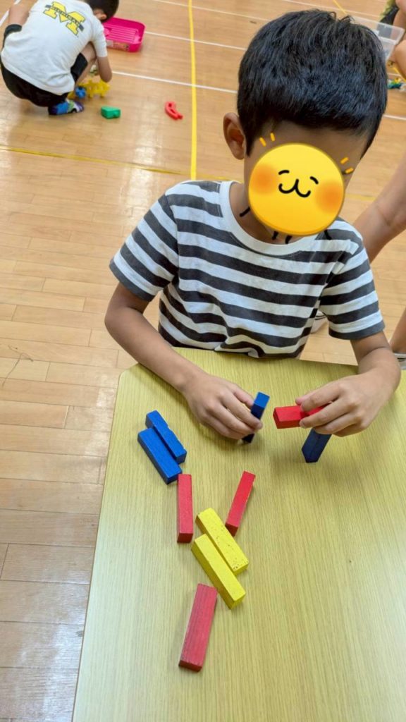 一見簡単に見える活動ですが、丁寧に下の段から積まないと上の段に行く過程で崩れてしまうので慎重さも大切な活動の一つになりました!
