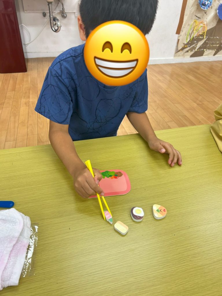 ➂のお箸チャレンジはお箸を使って指先の力のみでお弁当箱の中にお惣菜を頑張って入れて、