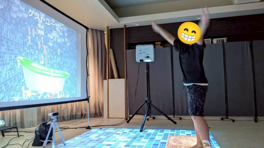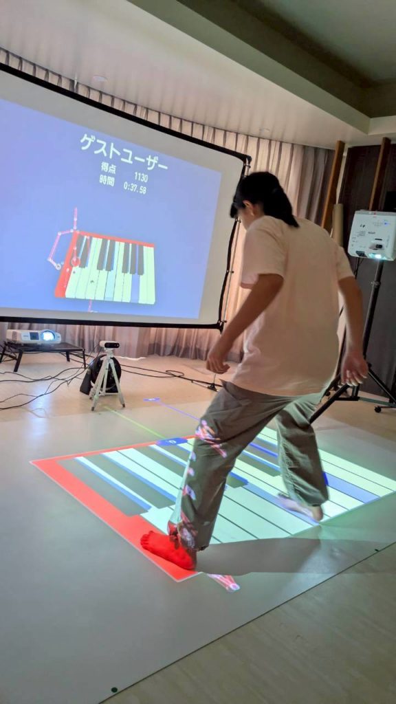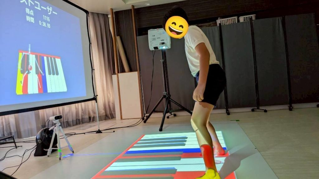 をめあてに取り組みました!スクリーンに映し出されるプロジェクションマッピングを元に、指先や足先の動きで音楽やリズムに合わせてステップを踏んでいきます!